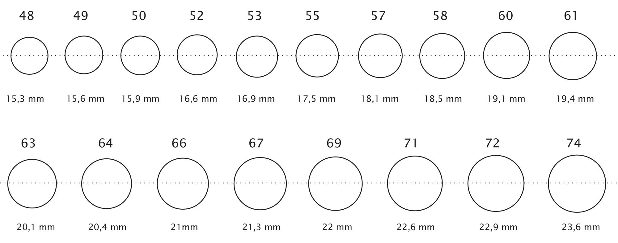 Die Zahl über dem Kreis bezeichnet den Umfang in mm (=Ringgröße)