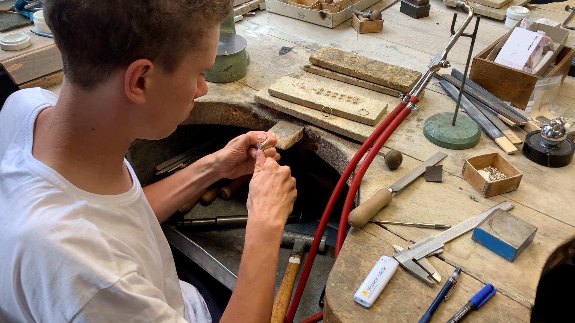 Christian Guthmann führt die Pforzheimer Schmuck-Manufaktur in vierter Generation. Sein Ur-Großvater hatte den Betrieb 1906 gegründet. Damals war das Schmuckmachen in Pforzheim auch Nebenerwerb für Bauern, die in den kargen Wintern ihr Einkommen aufbesserten. „Schmuck wird ja vor allem in der Weihnachtszeit nachgefragt, und in dieser hatten die Leute in der Landwirtschaft weniger zu tun; in dieser Pforzheimer Tradition habe auch ich heute noch einige Heimarbeiter, die je nach Auftragslage für meinen kleinen Betrieb arbeiten“, so Guthmann. Er hat das Goldschmiede-Handwerk von der Pike auf gelernt und die Goldschmiedeschule in Pforzheim besucht. Dennoch war sein Weg nicht vorgezeichnet: „Auch wenn man von einer Familientradition spricht, darf man sich das nicht so vorstellen, dass immer das Gleiche weitergeht. Dazwischen gibt es Krisen, vielleicht Zerstörung durch Kriege oder eben einen disruptiven Wandel aufgrund der Globalisierung.“